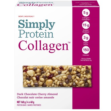 Get a daily boost of collagen and protein all in one. Each SimplyProtein Collagen¢ bar contains 5g of collagen peptides sourced from grass-fed bovine and 15g of protein. Simple ingredients for a delicious taste made with real tangy cherries, rich chocolate chips, and real almonds.
